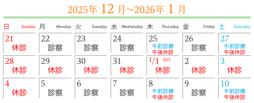 年末年始休診のお知らせ 公開済み: 2025-12-07更新: 2025-12-07作成者: まこと整形外科カテゴリー: お知らせ 2025年12月29日(月)から2026年1月3日(土)まで年末年始の休診とさせていただきます。 1月5日(月)から通常診療いたします。 ご不便をおかけいたしますが、よろしくお願いいたします。